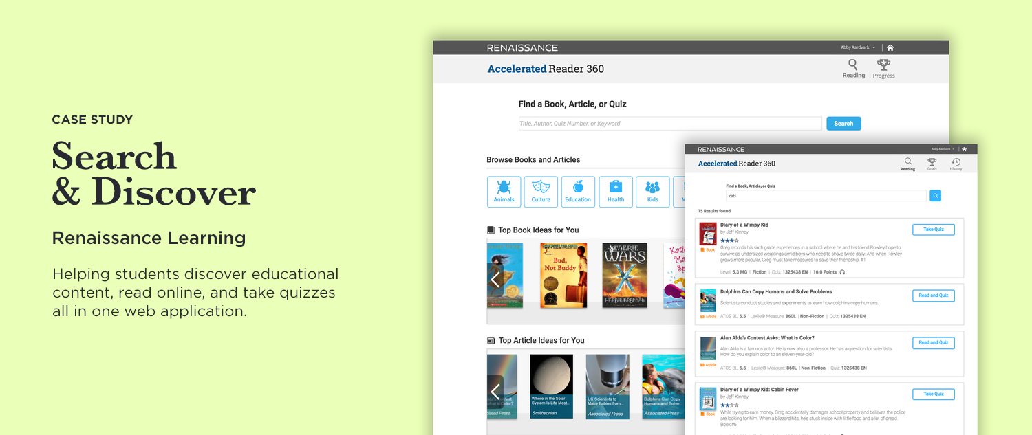 Our educational suite for classrooms help teachers access students’ math and reading levels through standardized tests, and in-class weekly assignments. One apparent need was to fix the disjointed reading experience for students — discovering online books, online articles, and taking quizzes on what they read were all separate flows from the student homepage. I was tasked with creating a more unified experience where students can browse both books and articles, and take quizzes in a more streamlined experience for students. My first step happens before my Scrum team actually works on the epic: I meet with the Product Owner and discuss the business requirements, and take notes of his thoughts and suggestions for potential directions I could take. I give my feedback and high level white boarding discussions, and then I hit the drawing board. One must have was to direct students to the growing library of non-fiction articles. Many schools have requested more non-fiction content for students to read, as there was already a wealth of fiction books to read.