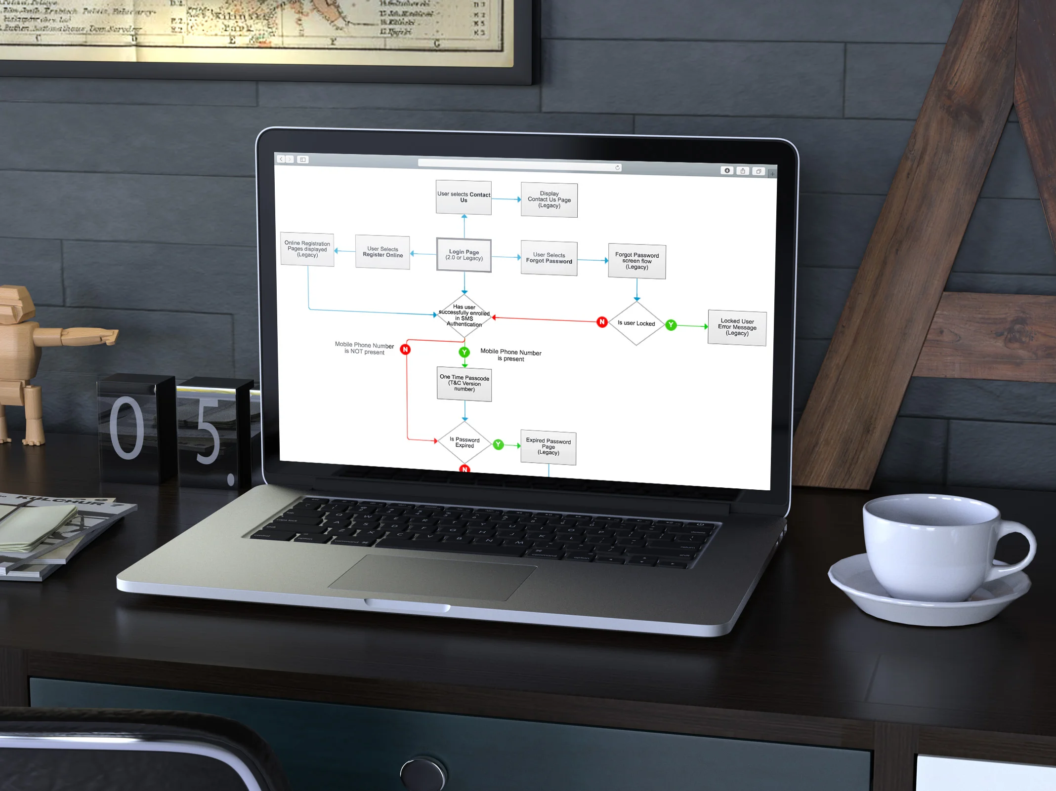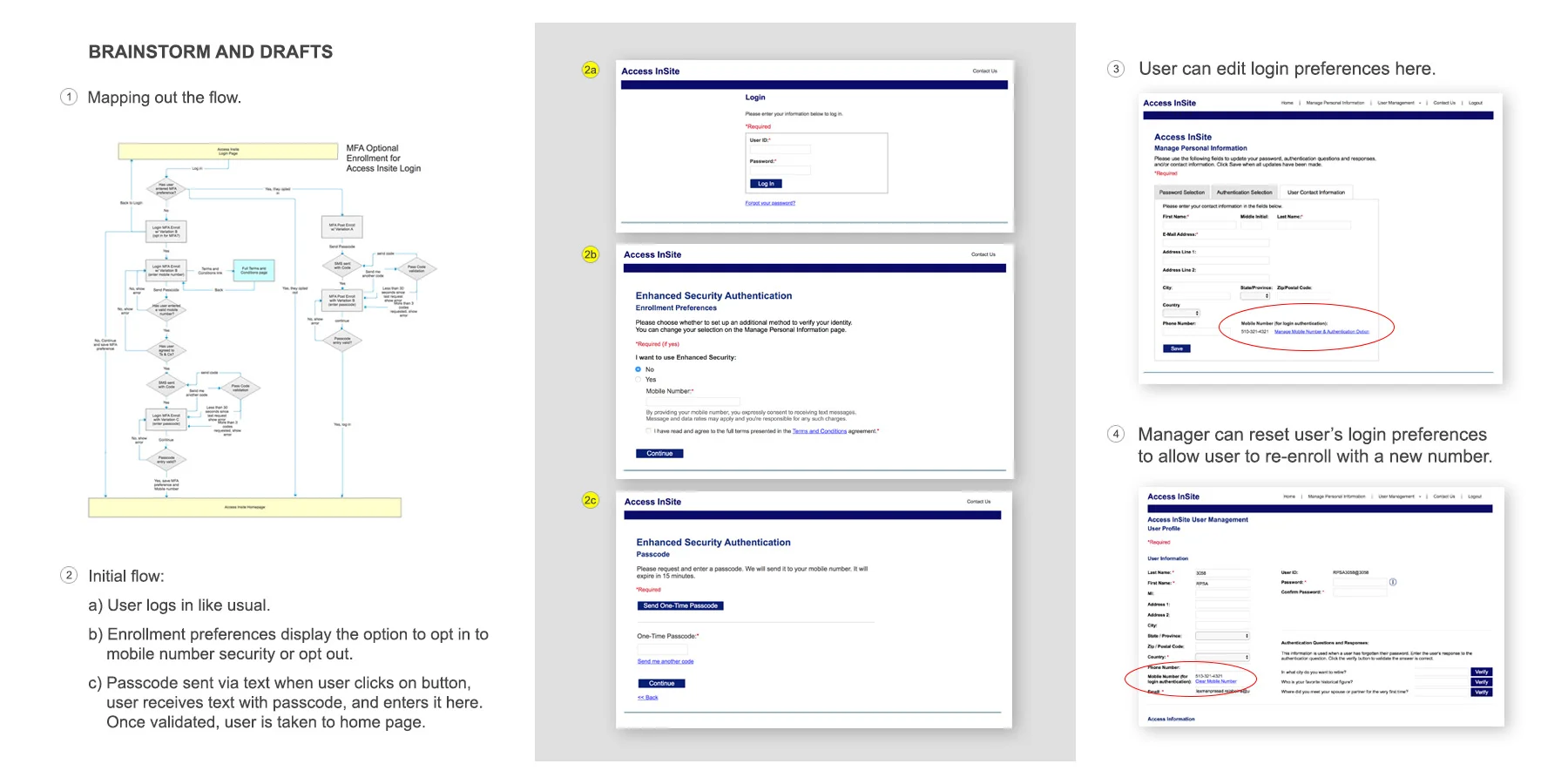 Working closely with the Business Analyst, the Product Owner, and system architect, we mapped out the current login flow. We then discussed and brainstorm how to include a second level of authentication for the user using a combination of a mobile text message and entering the passcode from the text to authenticate them.