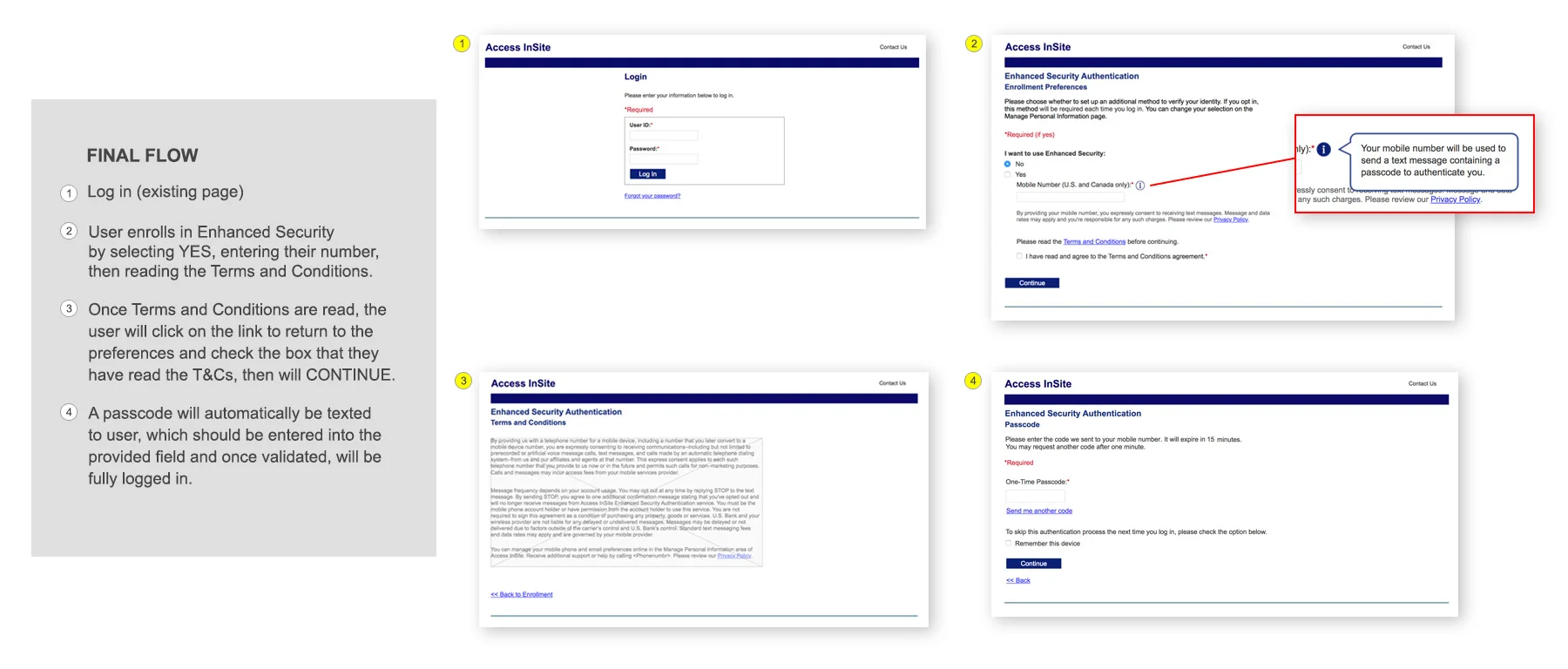 The final design incorporated numerous UX feedback sessions and usability test findings. I settled on separating out multiple steps into separate pages so that it would be easier for the users to follow, and well as for those that use screen readers (accessibility factors). Because of strict security requirements, I also incorporated a flow that requires the user to view/read and agree to the Terms and Conditions before they are able to proceed.