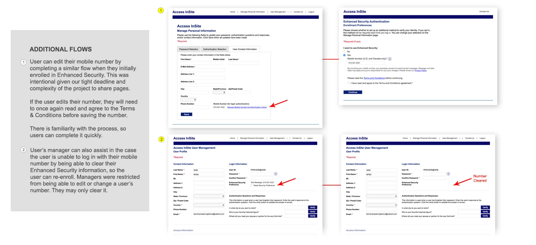 Other factors of concern was how to display terms and agreement, how to verify a new mobile number if they enroll for the first time, how to clear/change a mobile number if it is no longer valid, and also to ensure that it adheres to ADA standards.